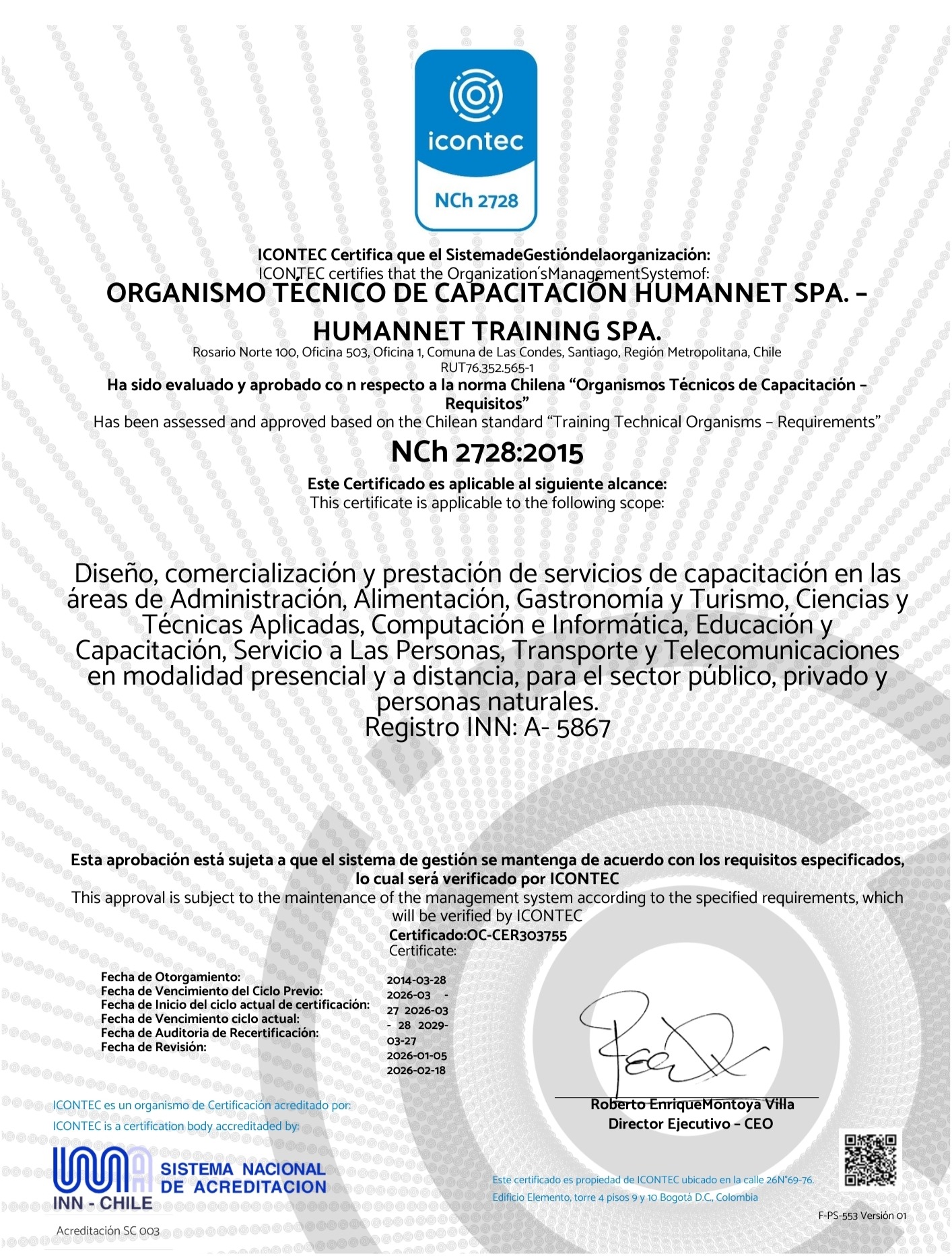En Chile estamos certificados bajo la Norma Chilena 2728, convirtiéndonos en un Organismo Técnico de Capacitación (OTEC), permitiendo a las empresas chilenas clientes hacer uso de su Beneficio Tributario SENCE.